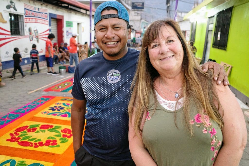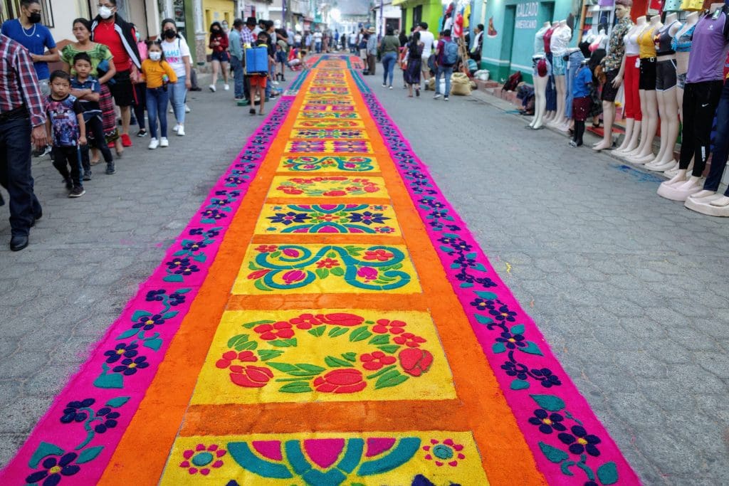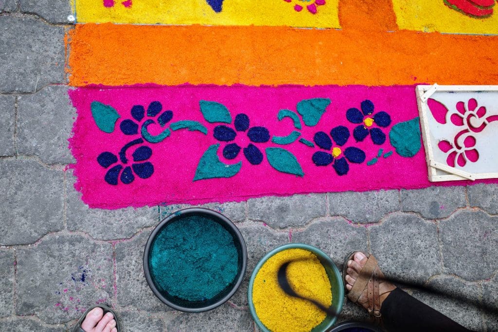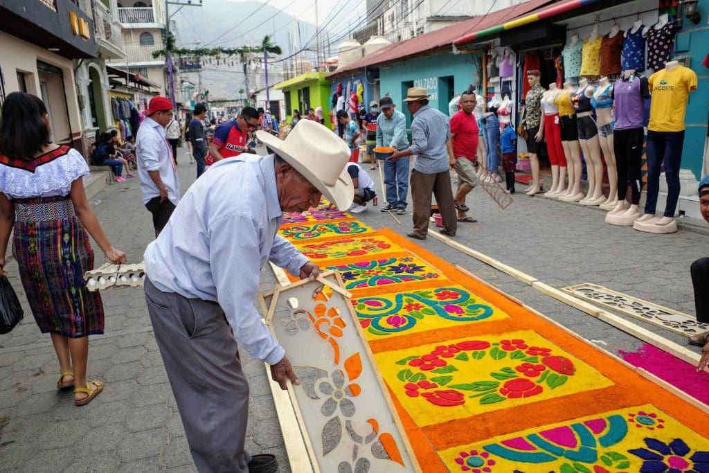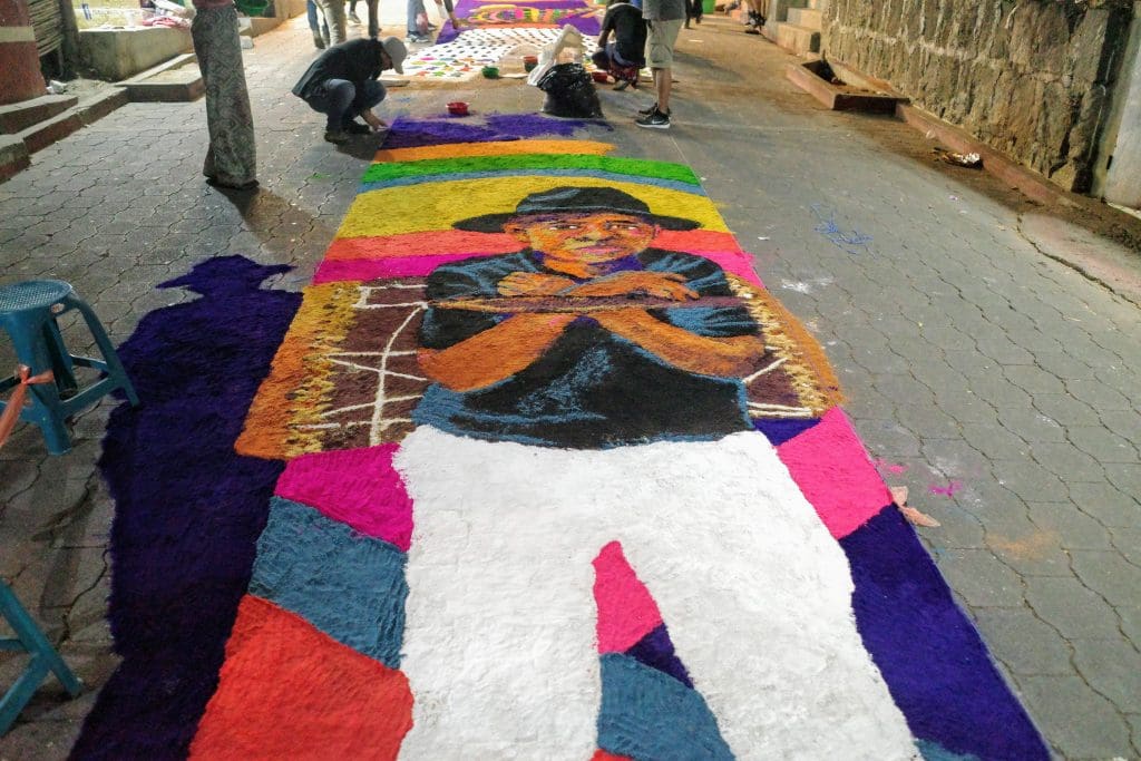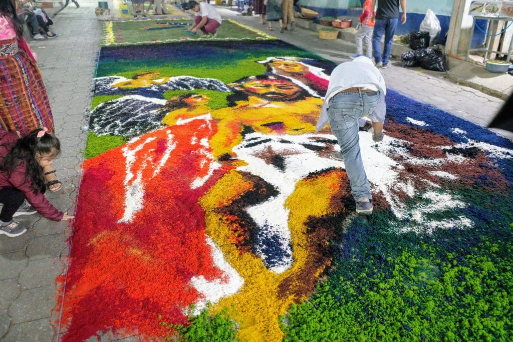 No, Vicky Ann is not buying carpets (though she does manage to attract a crowd of vendors wherever we walk). The alfrombras that appear on Good Friday are special ones that cover the streets just in time for the evening procession. And they are not made of wool or cotton, but from sawdust tinted in bright colors or from fruits, vegetables, flowers, and other plants typical of Guatemala. Some artists also paint directly on the pavement.