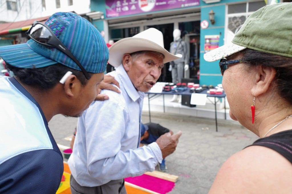 Besides her Spanish skills, Vicky Ann has quite the eye for amazing photographs, with a particular focus on men of a certain age. On one block, we were approached by a young man who had noticed Vicky Ann zooming in on a handsome elderly gentleman who was moving up and down the street checking the progress of the alfombra.