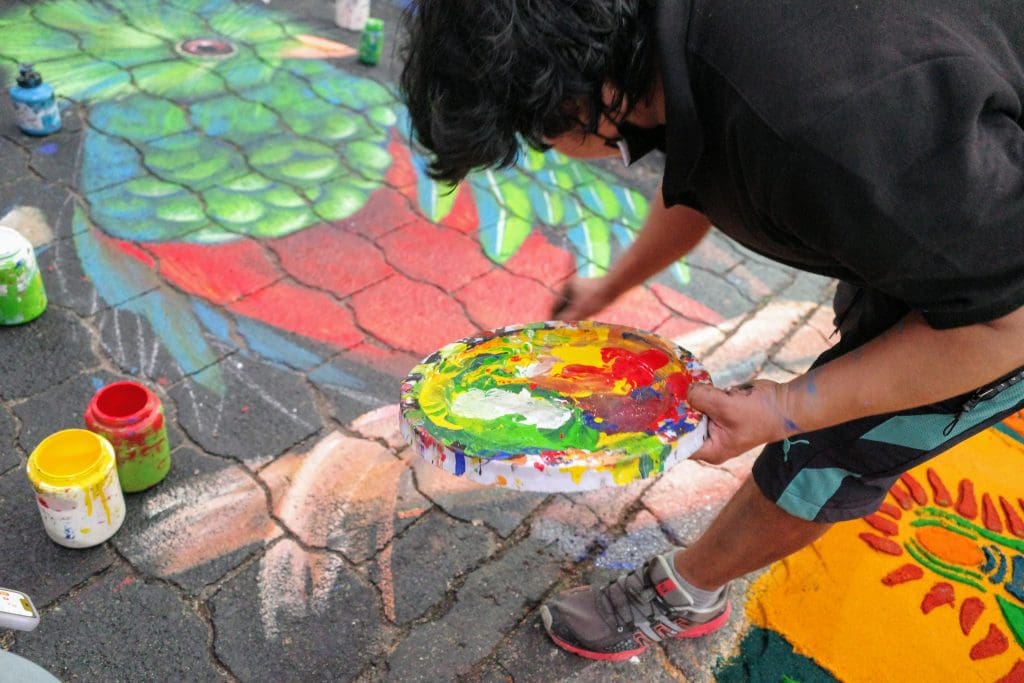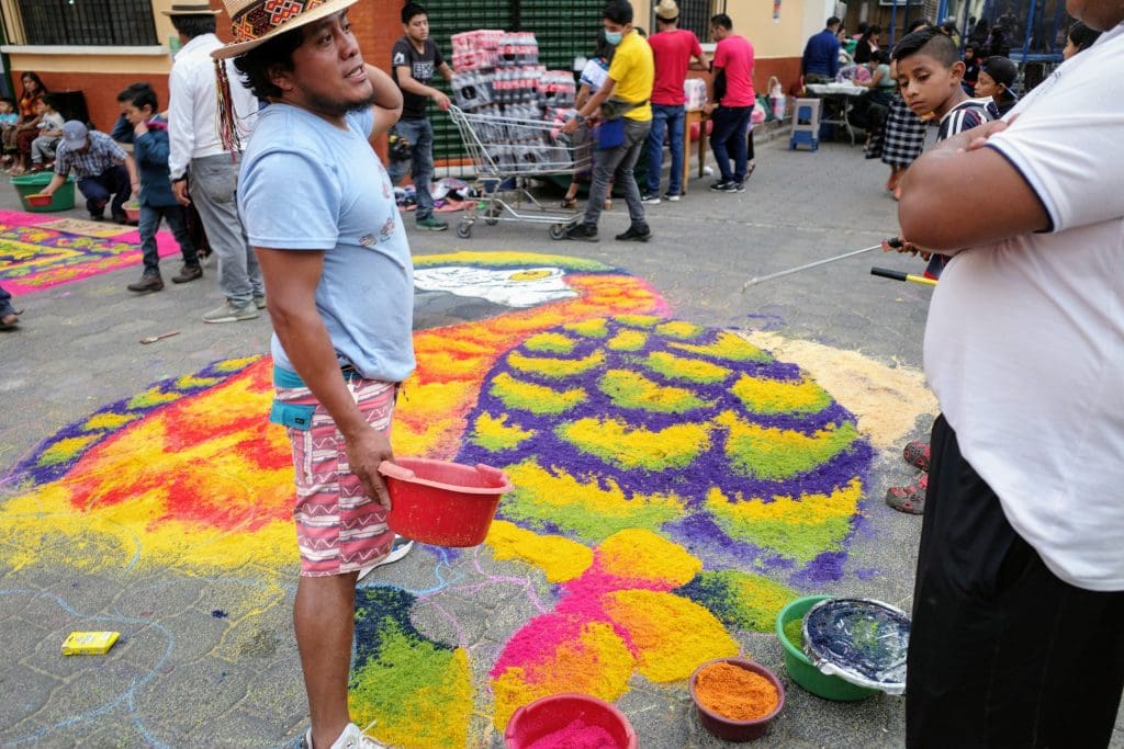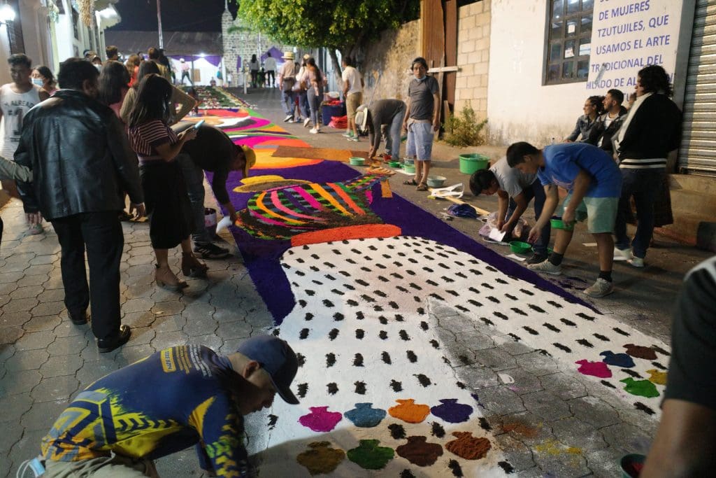 Juan Diego told us that the man was the one who was in charge of the project and that all of the people working on the carpet were from his family or volunteers (he is the nephew of the grandpa.) Every alfombra is designed and created by a family from the village. In this case, the children of the family submitted designs to the grandpa, who then chose the final design. The family finances and plans every detail of the operation.