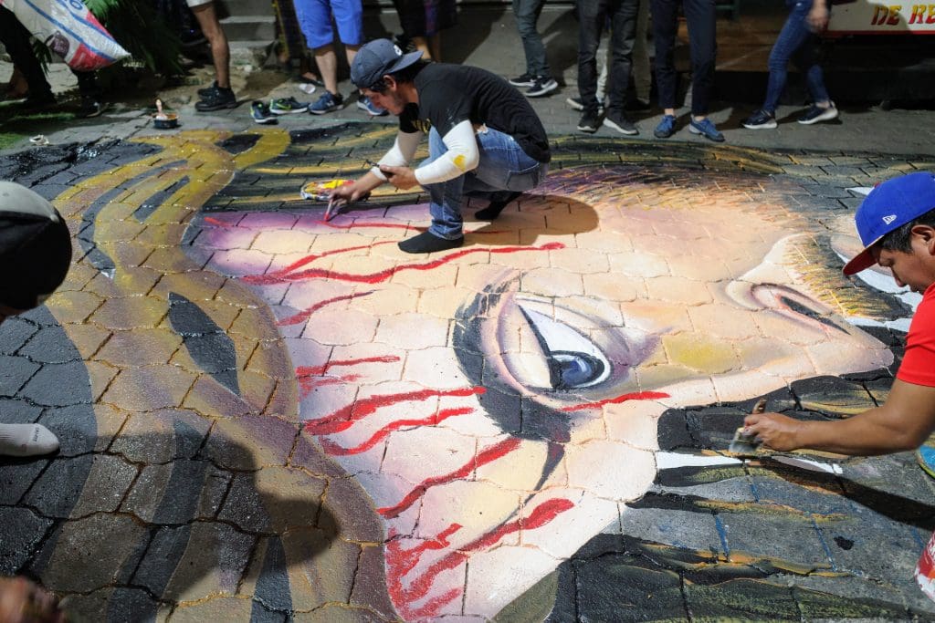 The procession passes over the beautifully designed alfombras that had taken all day to create and a year of planning and raising funds. As soon as the procession passes, people take what they can salvage from the ground and a crew sweeps everything else up. The carpets disappear in minutes.
