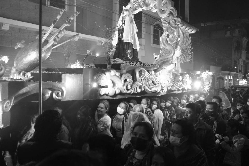 During the procession, which started at 9:00 pm, hundreds of people lined the narrow streets as the devoted carried huge floats depicting religious scenes. Some were carried by men and some by women. They would stop at every block for a rest before hoisting the heavy floats in the air once again.