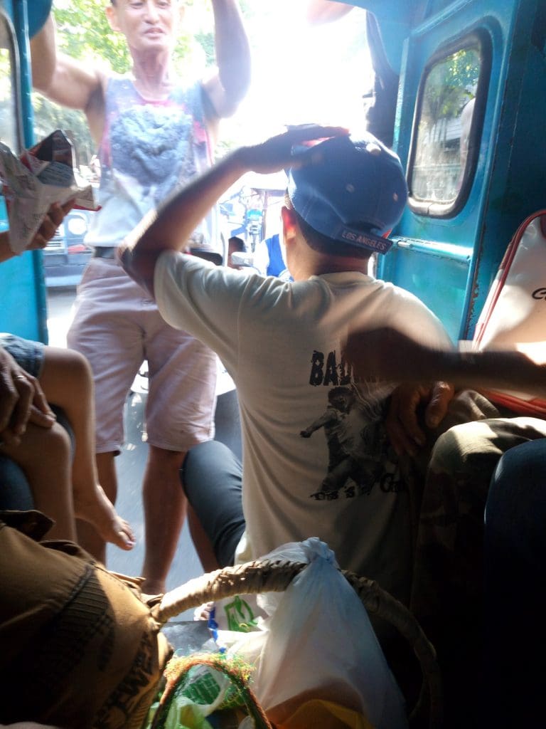 - Say “para” or tap coins on the handrail or bang on the roof when you want to exit. There is no graceful way to exit a jeepney. Just crawl over the aisle of packages and legs while trying not to hit your head on the low ceiling or fall into someone’s lap. If you have a package, the person near the exit will hold it for you while you stumble out onto the road.