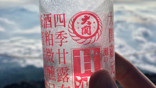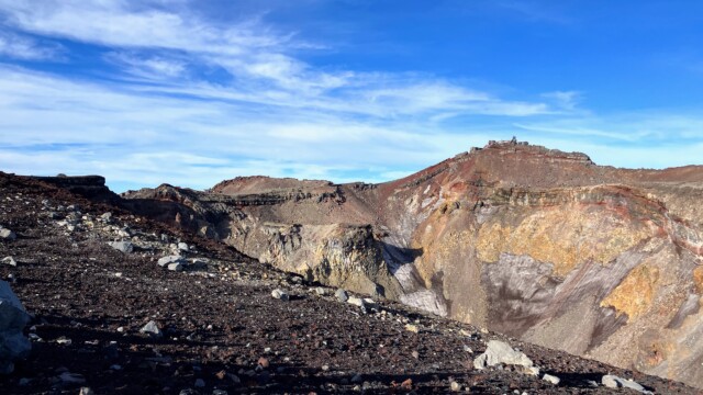 We congratulated each other, took tons of pictures, spent time to just absorb the beautiful and ever-changing view, peered into the crater of the still-active volcano (where there was still some dust-covered snow), and rested for what we were told would be an even more difficult descent. I also celebrated with a glass of a hot white sake drink for sale at the summit.