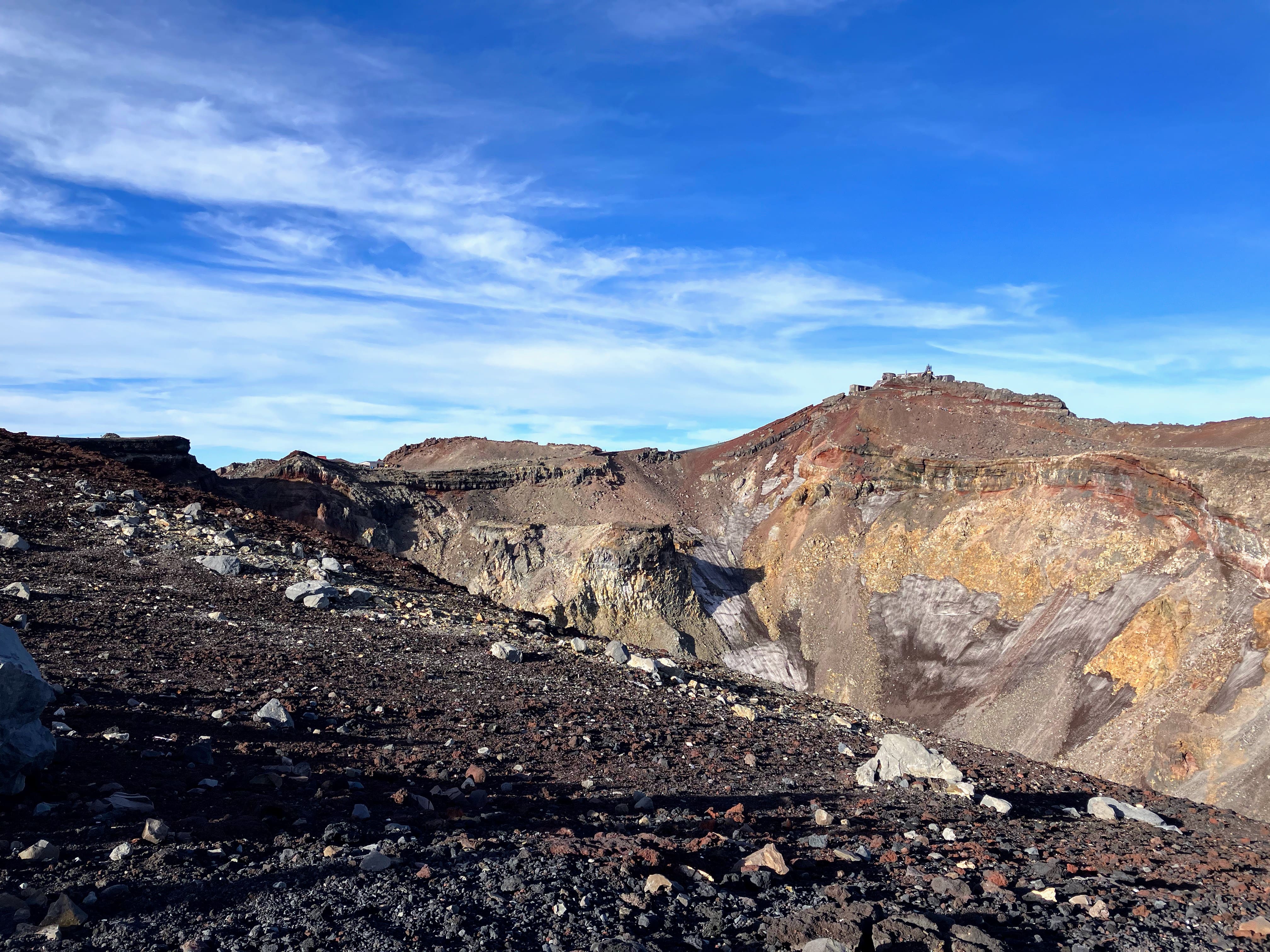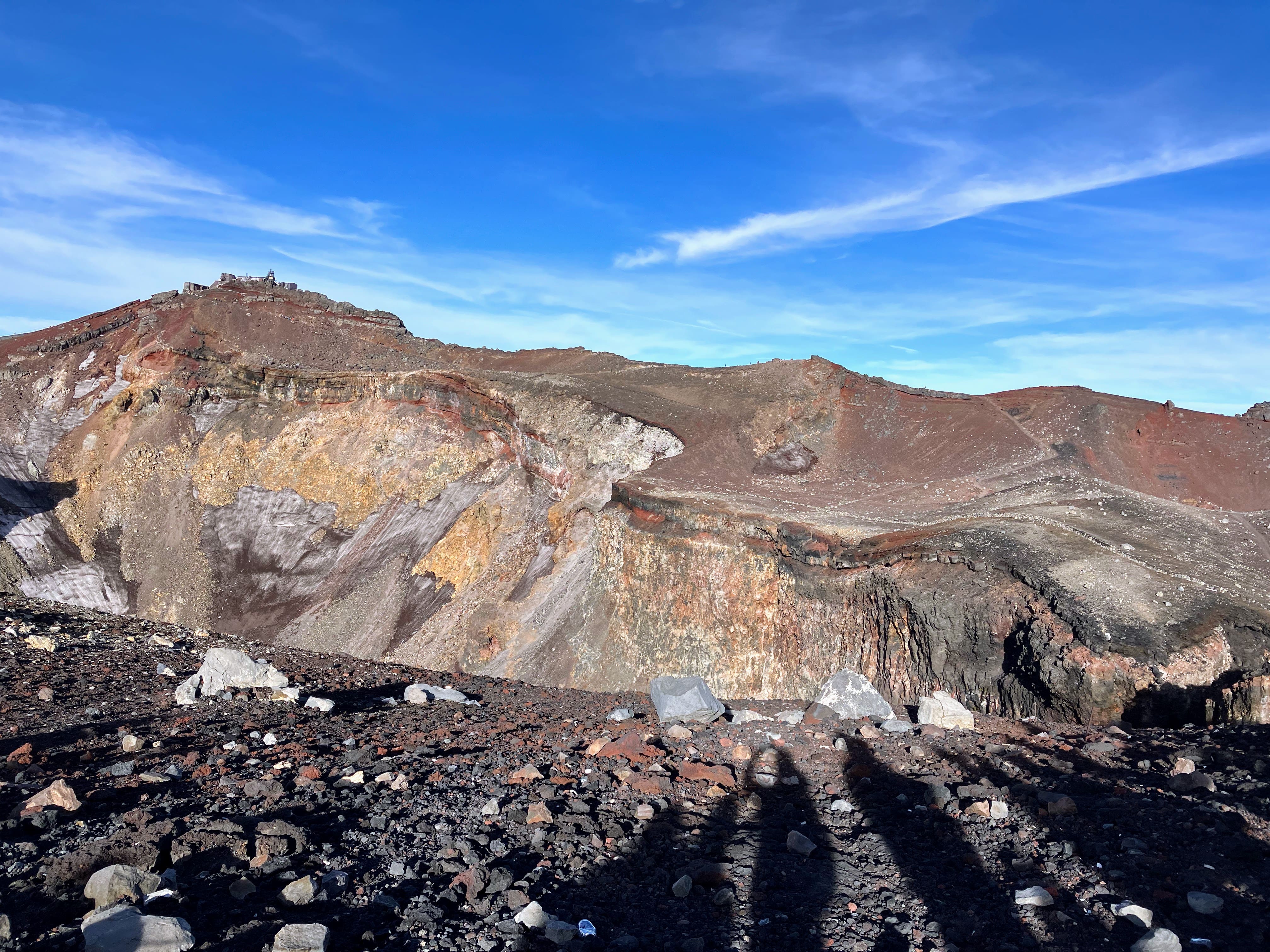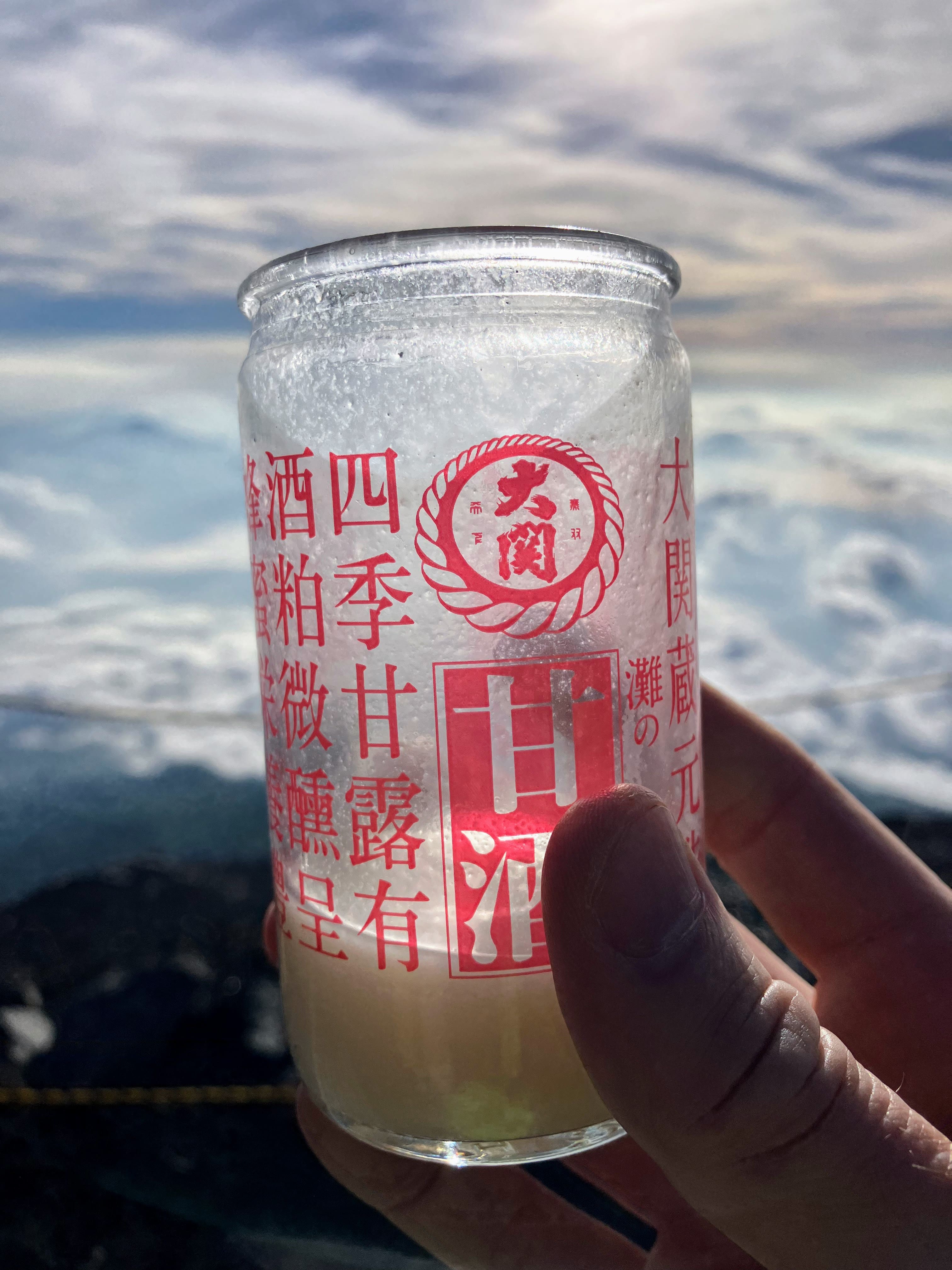 We congratulated each other, took tons of pictures, spent time to just absorb the beautiful and ever-changing view, peered into the crater of the still-active volcano (where there was still some dust-covered snow), and rested for what we were told would be an even more difficult descent. I also celebrated with a glass of a hot white sake drink for sale at the summit.