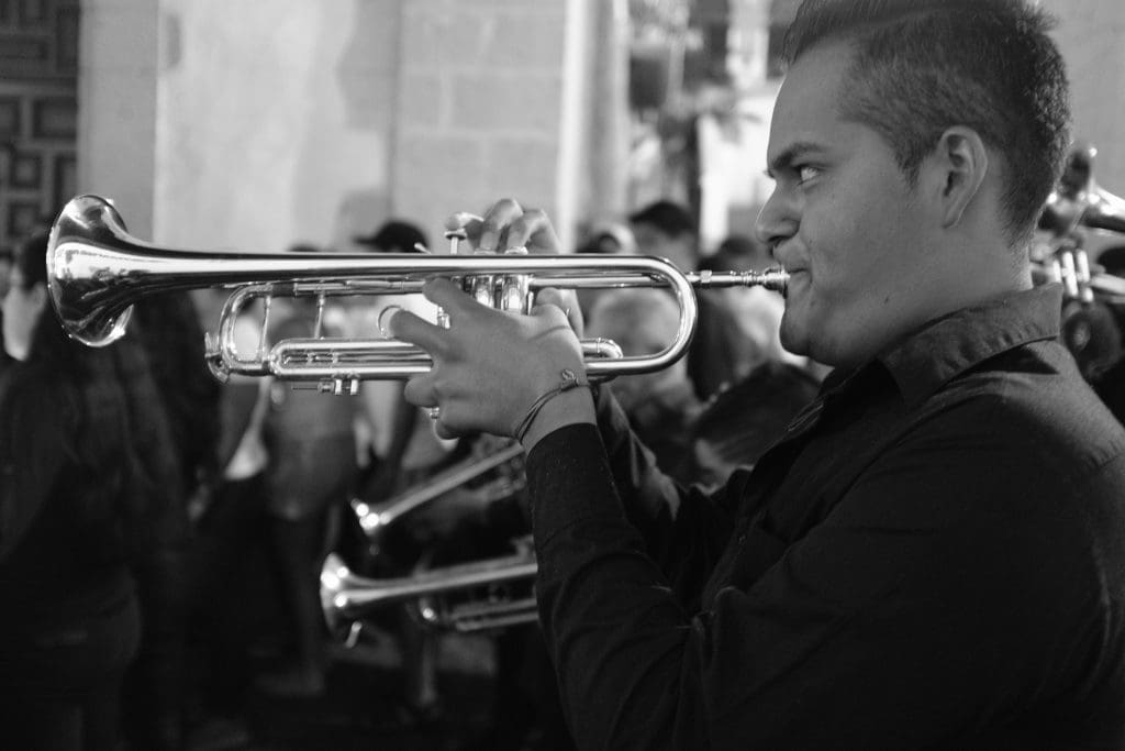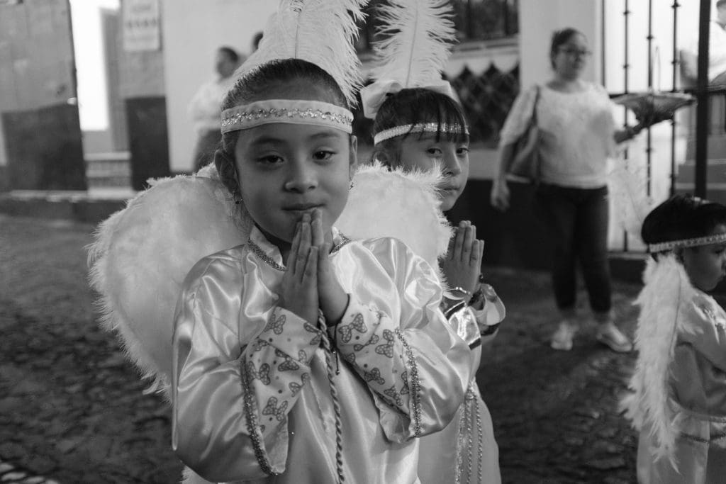 Each group is from a different church and carries their own decorated statue fitting the theme of the night. Children dressed as angels lead most of the groups, followed by incense-waving marchers. Interspersed are the penitents, the most powerful and moving part of the processions, which I will explain in the next post. Each group has a few musicians playing drums, violins, and trumpets along the way.