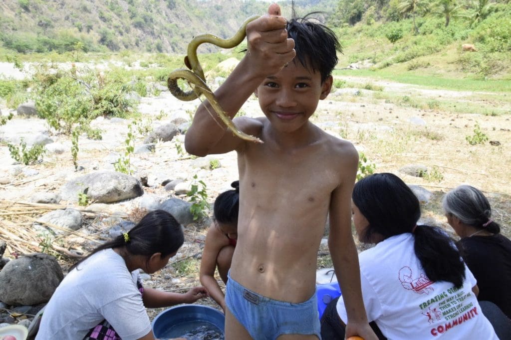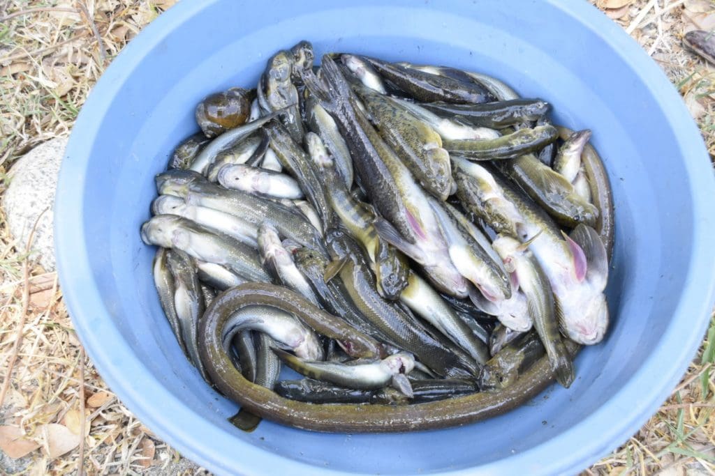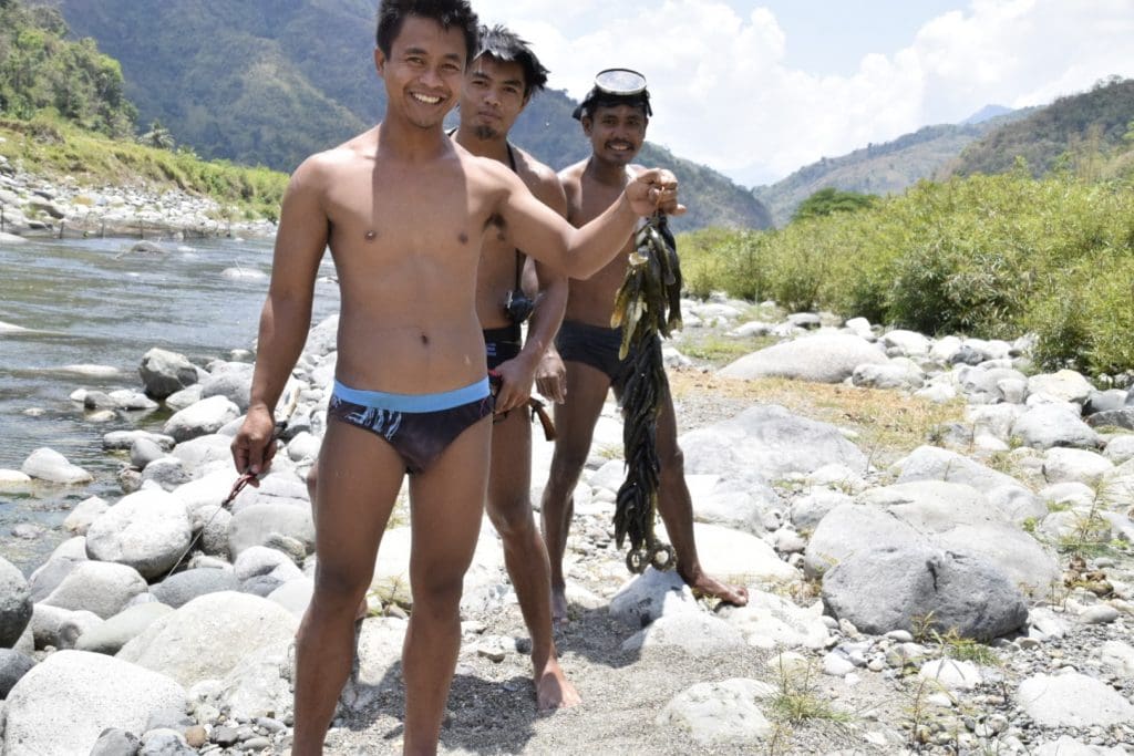 I knew there would be fish, but what I didn’t know was that McTery’s father and other uncles were already catching our lunch further up the river. They use a sort of slingshot with a wire that impales the fish when shot. By the time I reached them, they had caught quite a few, along with one eel, and McTery was catching some himself.