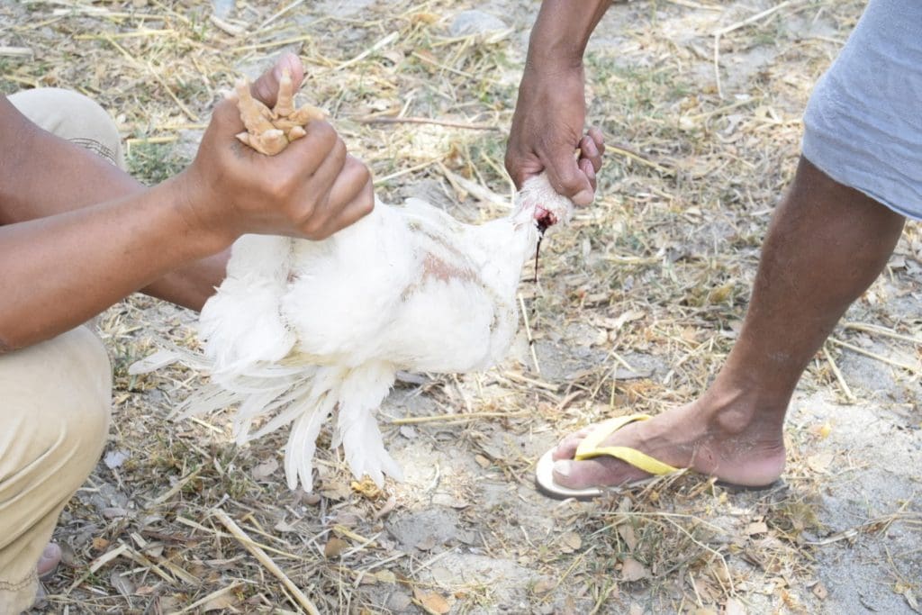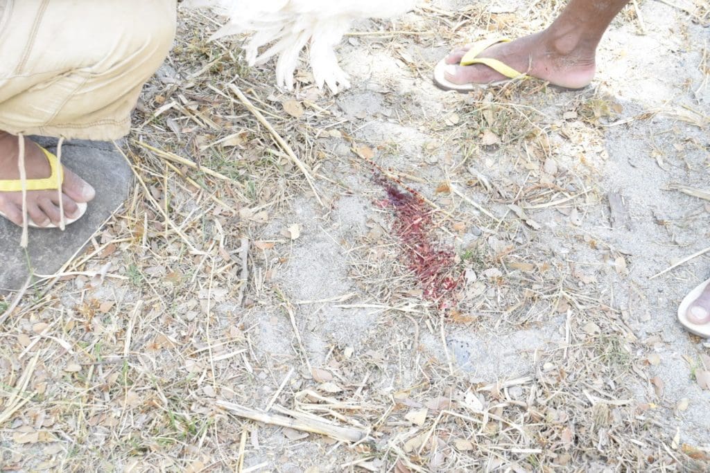 We walked back to our picnic area under a tree and the aunts were preparing the other parts of the meal: mango salad, fruit salad, fish stew and rice. Abraham was sent back to get the chicken we had bought the day before. The uncles slit its throat, drained the blood and started burning the feathers off over the fire while the wings were still flapping.