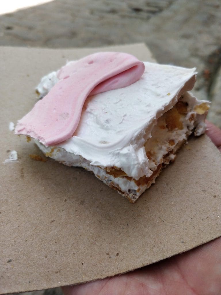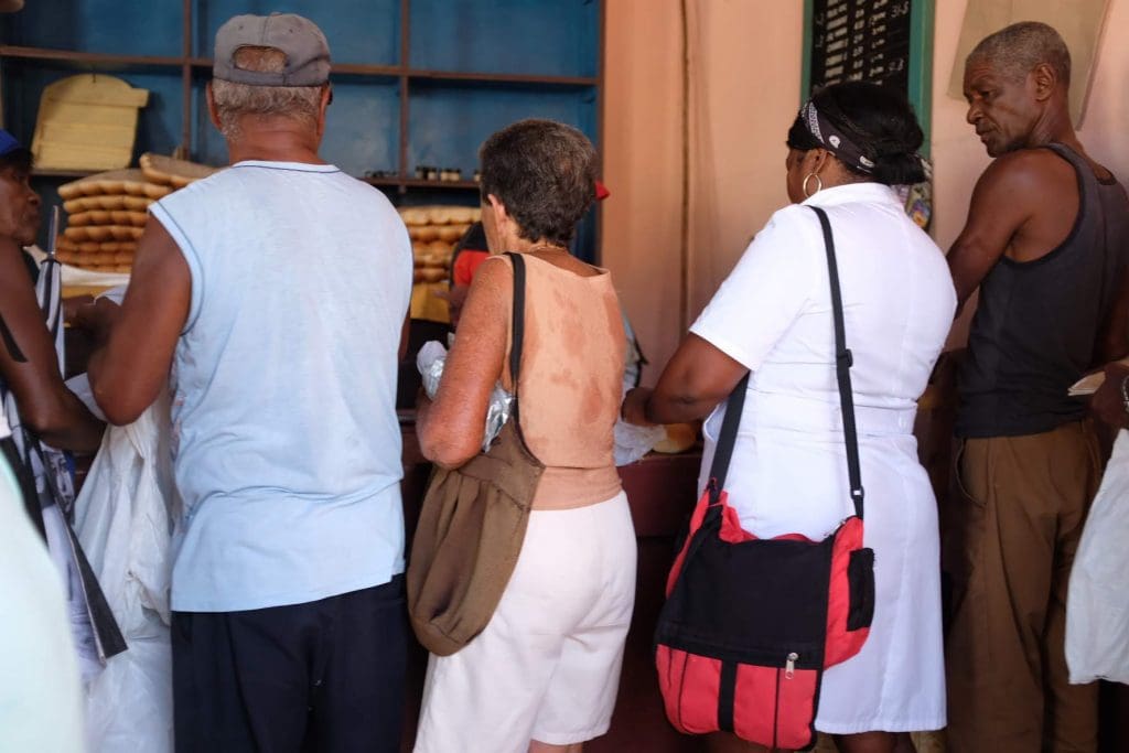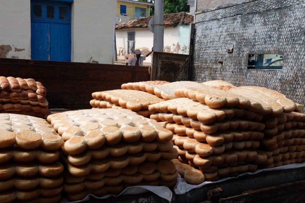 When I saw the kids sitting on the sidewalk eating something that looked like cake loaded with icing, I knew I wanted one. At the end of the block, a woman stood staring at me, not even trying to hide the white smears of icing on her cheeks. Across the street there was a line outside a door. When I got inside, I saw that there were just three items for sale: one sheet of the icing treat, some cookies, and a few small loaves of bread. I was charged what I thought was 3 CUCs for a large square of the multi-layered icing-covered crackers. This is equivalent to $3, so I figured I was just paying the tourist price. When the girl behind the counter handed me a wad of cash as change, I realized my mistake. The cost was just 3 pesos in “moneda nacional,” the local currency, or about 12 cents.